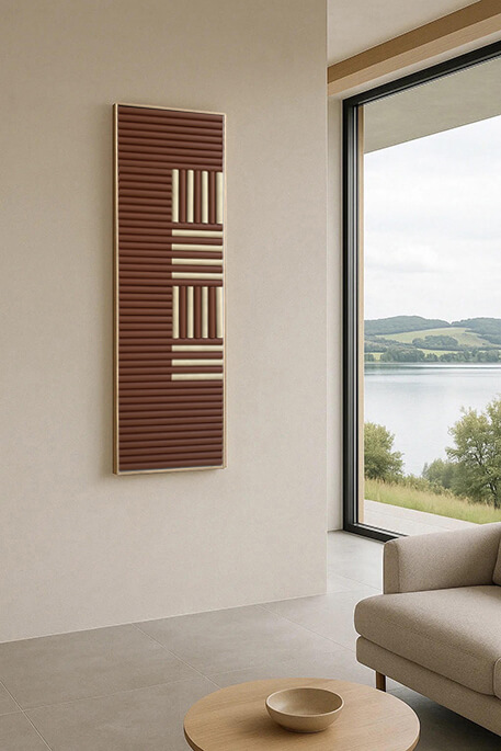 Værket fungere som både kunst og funktion: En sanselig flade, der tilfører varme, dybde og en stilhed til rummet.